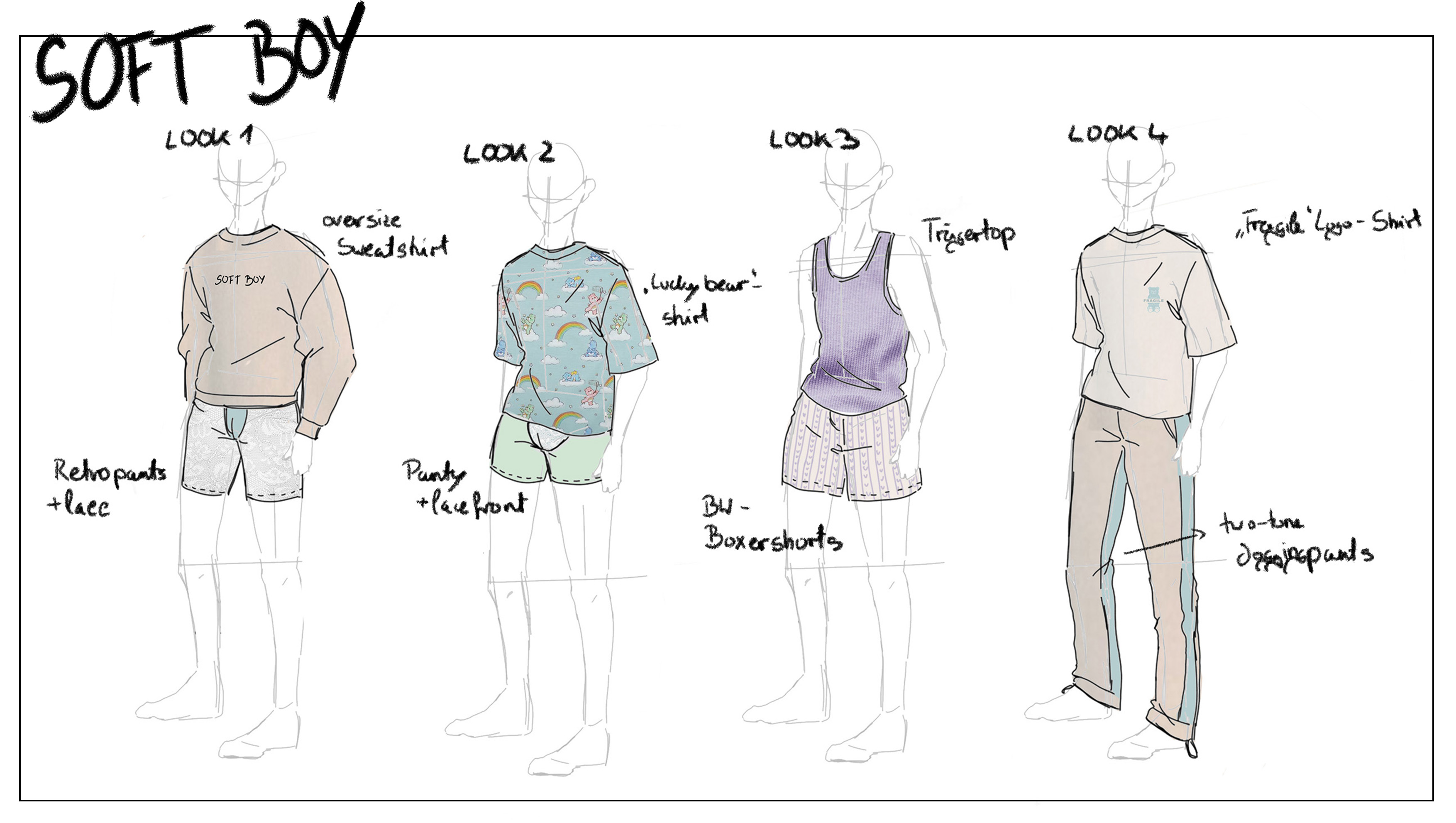 „Soft Boy“ ist eine Lounge- und Wäschekollektion, die im Rahmen der Lehrveranstaltung spezielle Modellentwicklung HAKA Wäsche entstanden ist.